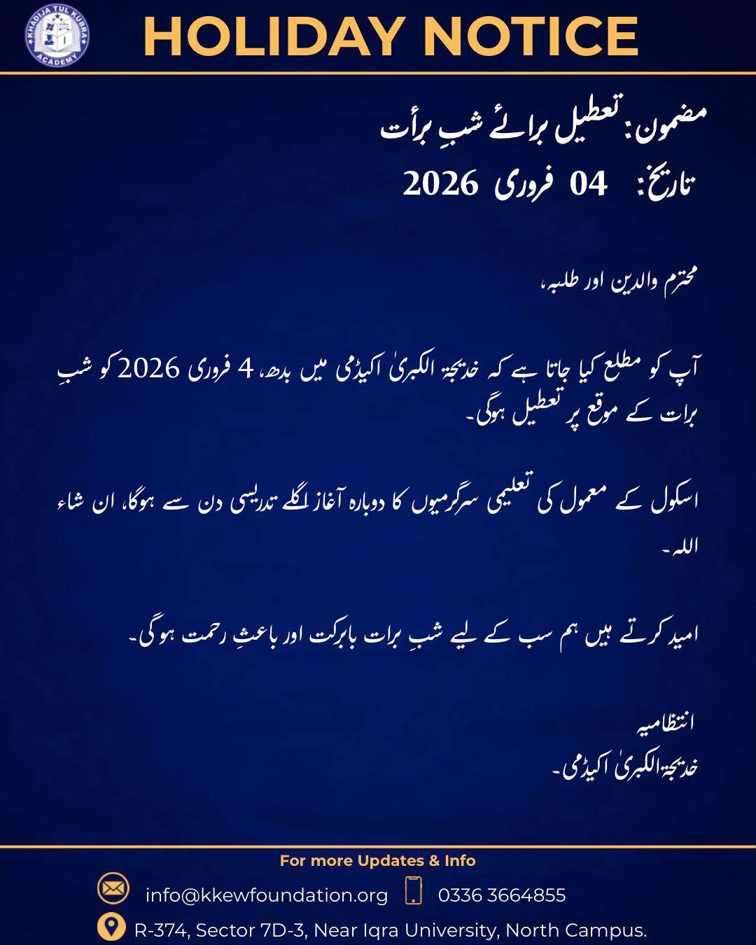 اہم اطلاع #ShabeBarat #schoolholidays #holiday Date February 2, 2026 اہم اطلاع 📢 #ShabeBarat #schoolholidays #holiday Source admin Previous post IMPORTANT NOTICE #ShabeBarat #holiday #schoolholidays February 2, 2026 Next post Measurement of Outer Diameter of a Piece of Glass Using Vernier Calipers (Class ... February 2, 2026 You may also like We are Hiring Qualified & Experienced Teaching Staff! Apply now and Avail the o… April 11, 2026 IMPORTANT NOTICE for Parents & Guardians! #boardexams #Notice #Class9 #Class10… April 8, 2026 FINAL CALL FOR ADMISSION! Limited Seats available. Hurry up and get your child e… April 8, 2026