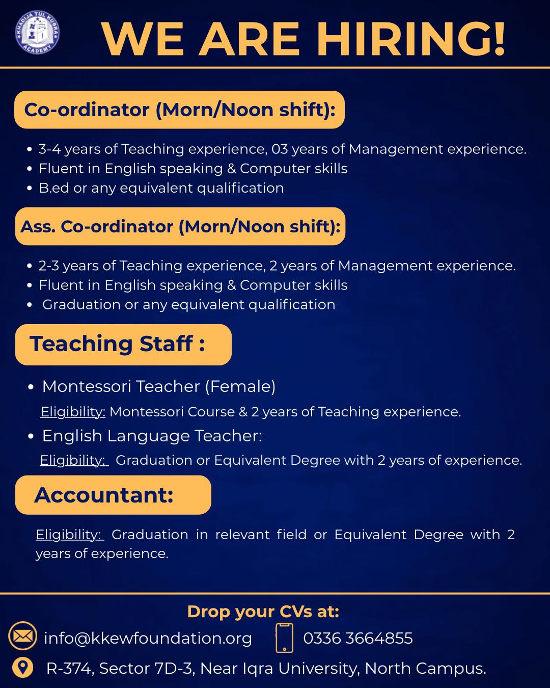We Are Hiring! Join Khadija Tul Kubra Academy and be part of a dedicated team sh…